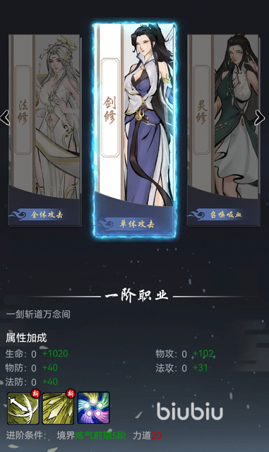 第四个职业为剑修,这个职业听名字就知道很霸气了,属于单体攻击角色,可以对敌方单个目标快速造成致命伤害,而且收割能力也很不错,可以快速的收割对手,对于残血很不友好,他的攻击力是所有职业中最强的。