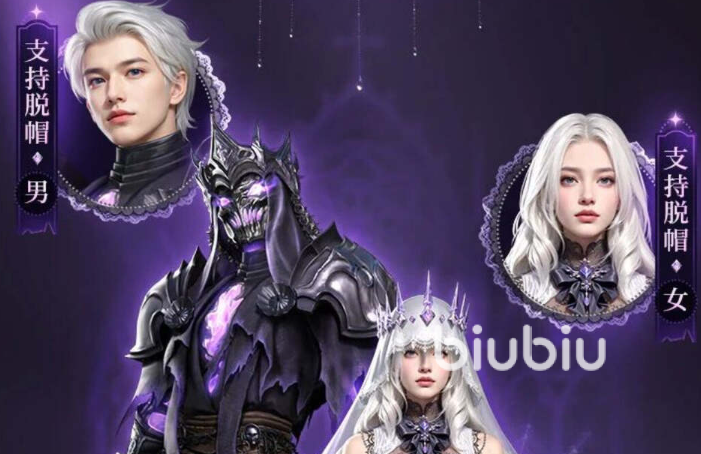 “净罪颂祷”套装,是兼具神圣与诡魅的服饰,女款时装以冰晶王冠和纯白头纱为主调,搭配蕾丝袖口与幽火装饰。男款造型则以银甲护体、胸口的紫焰为象征,荆棘王冠彰显出审判的庄严与冷峻。