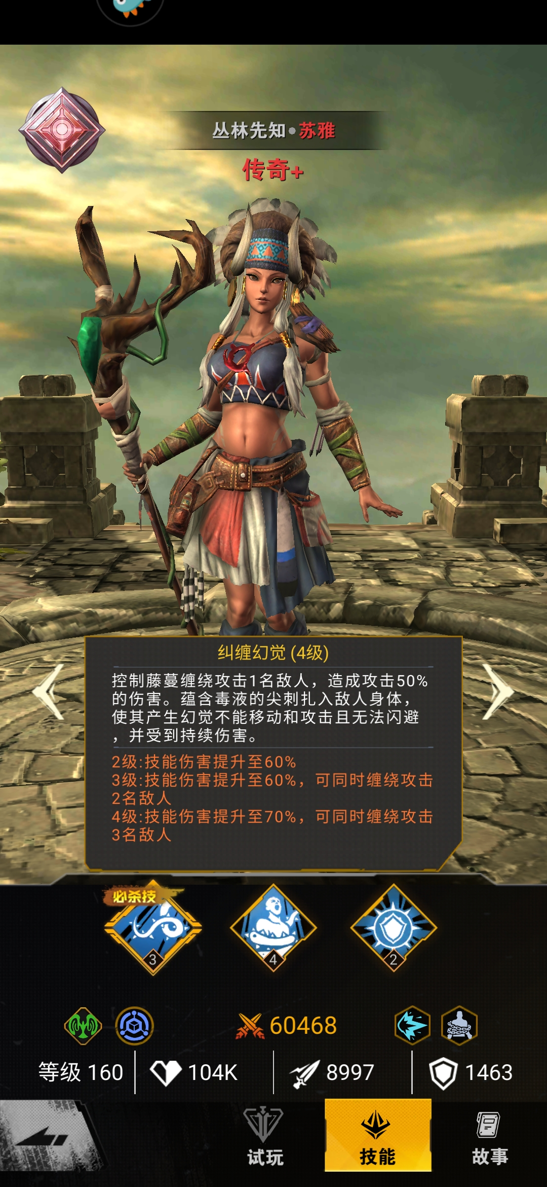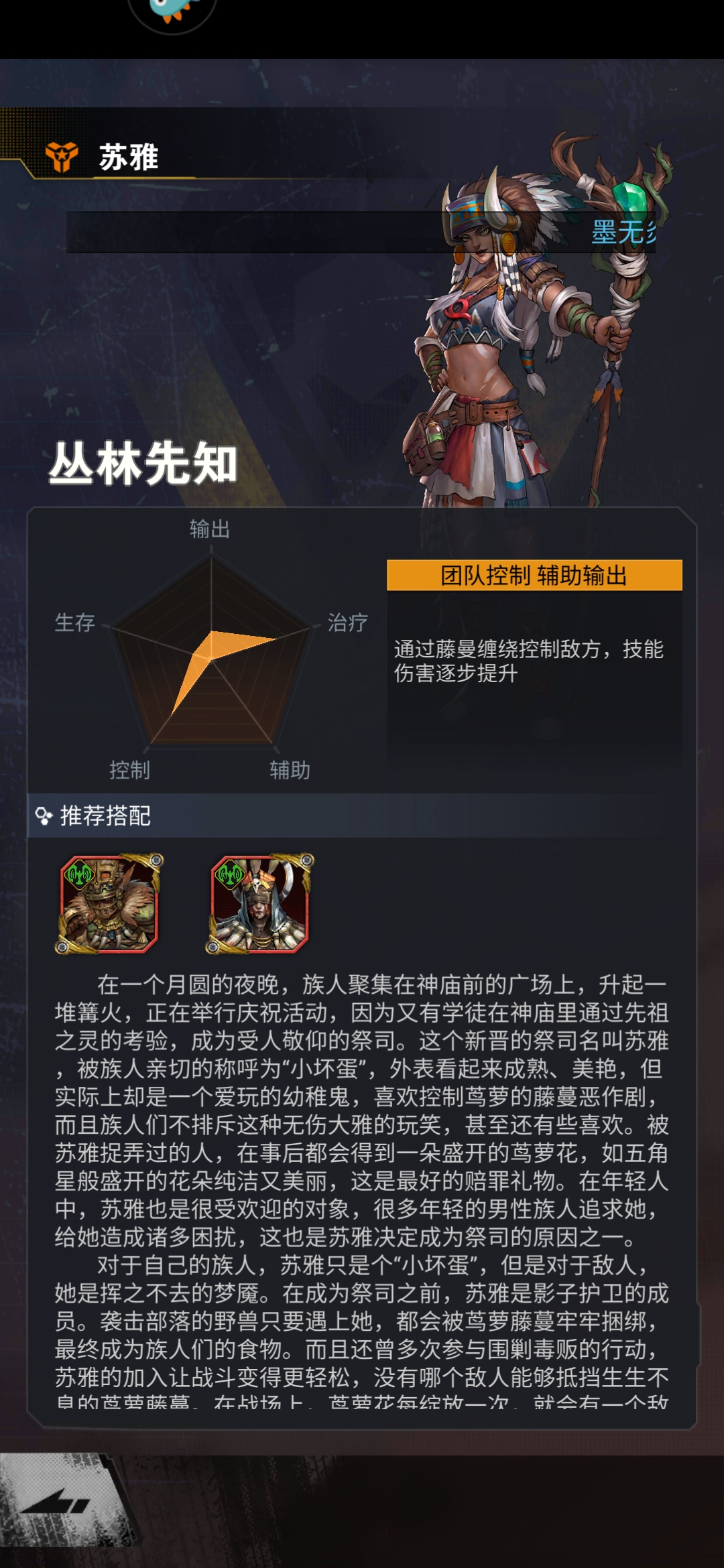 苏雅作为部落种族的一名团队型英雄,主要伤害来源于植物系的藤蔓攻击,利用藤蔓困住敌人,减缓敌人的输出空间,同时配合荆棘系技能,造成对方英雄持续性掉血。同时为友方英雄叠加增益型buff提升友方输出能力。