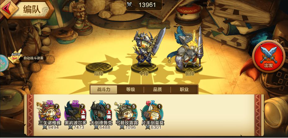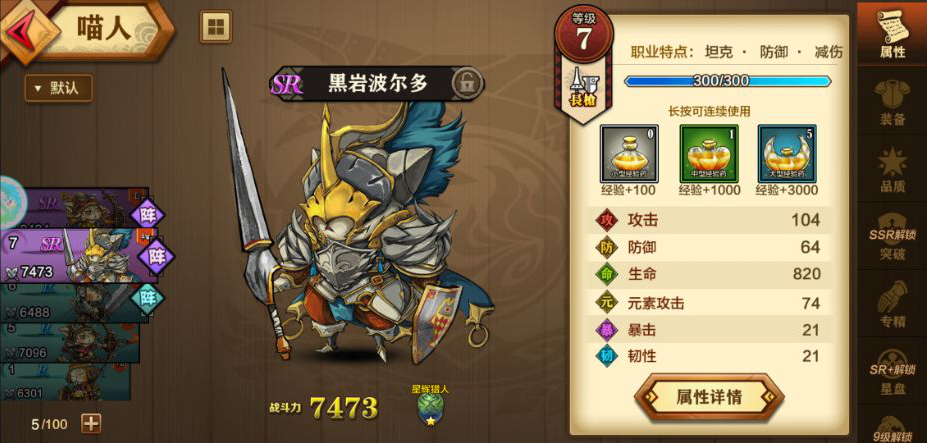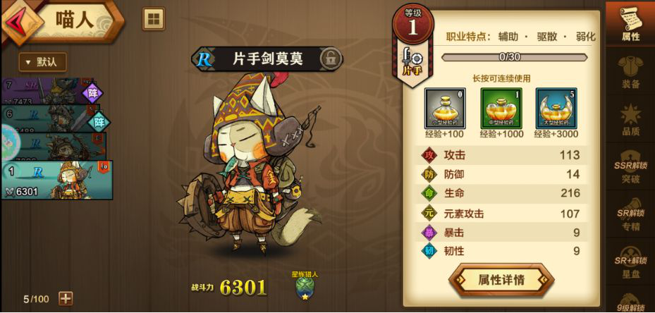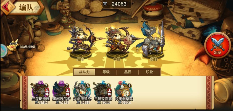 到了这里算是可以进行编队的调试了,可以看到系统将队伍分成了前中后三排位置,我们可以根据已经拥有的喵人自由进行组合,初始我们的喵是按照战斗力进行排序的,可以自由选择等级或者职业找到编队里合适的成员。
