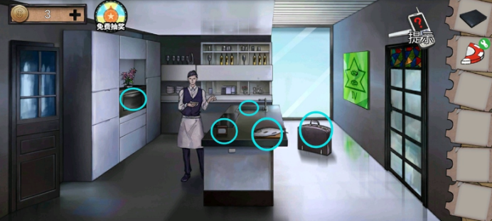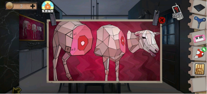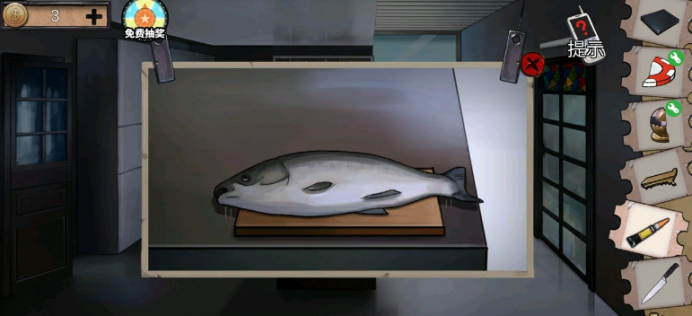 房间的四周会有涂鸦,我们结合密码上的提示就可以轻松的找到他们之间的规律得到密码2547,我们输入密码就可以打开柜子了,获得了一把刀。回到厨房,我们用到刀把鱼给割开就可以获得另外半把钥匙,组合一下得到完整的钥匙,然后用钥匙打开左边的门获得了另外半个门把手。