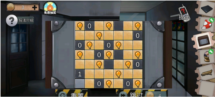 进去后我们拿走桌子上的盒子,水池里的把手,在箱子上有锁,这里的密码为426,接着我们将蜡烛放进烤箱,融化之后我们就获得了半把钥匙,然后我们根据玩法规则点亮所有的暗色方块,完成之后就可以打开盒子获得强力胶水了。