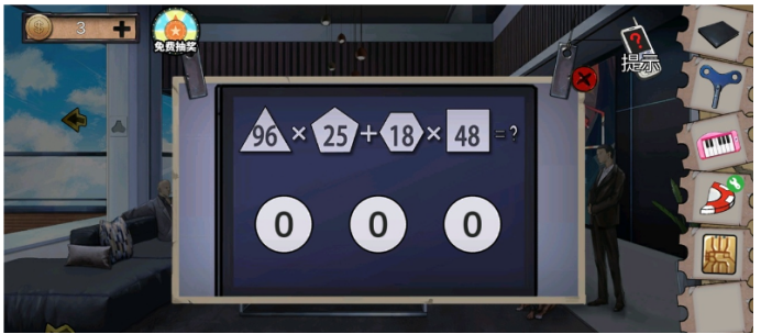 这一关中,玩家将在客厅中完成解谜通关,我们点击右边的柱子,用遥控器激活,观察上面的提示。在餐厅中有一副画有提示,我们就可以得到一个密码196,在客厅中我们就可以输入密码打开机关获得一封信。