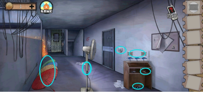 上一关中,男主人公被绑架,在这一关中只有女主人公解密了。在走廊捡起电池,伞,零件等等。然后用钥匙打开左边的铁门。拿走鞋子里的锤子。和柜子里的开瓶器。