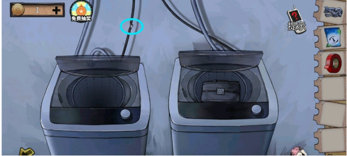 点击洗衣机,我们发现其中一根线是断的,我们将最开始我们拿的衣服放进好的洗衣机里面,再放洗衣粉,把衣服洗干净,用胶带修理断了的电线,衣服洗干净后,衣服上面会有提示,记住他的提示,打开右边洗衣机的盖子,完成解谜,把蓝色全部移到中间就可以完成解谜了。