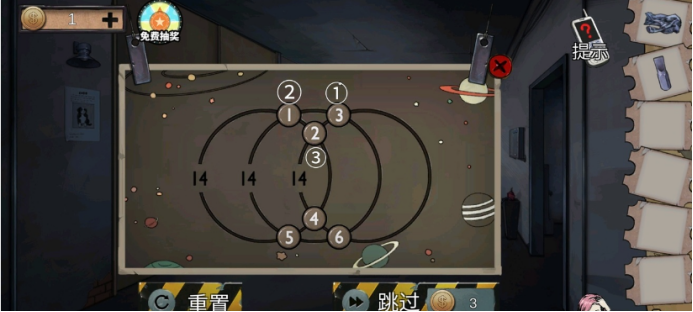 我们调整图上的数字,使得他们加起来之和为14即可。完成揭秘之后,门就会打开,水桶里面有洗衣粉,旁边还有个格子画,记住它。