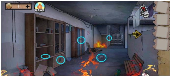 在这一关内由于一场大火会将男主人公和女主人公分开,我们先切换到女主人公的视角,把地上的衣服,柜子里的书,和柜子下面的抽屉,铁门旁有机关。