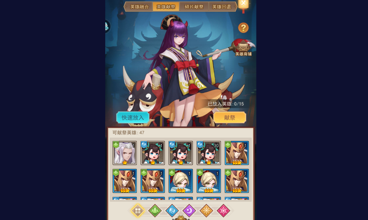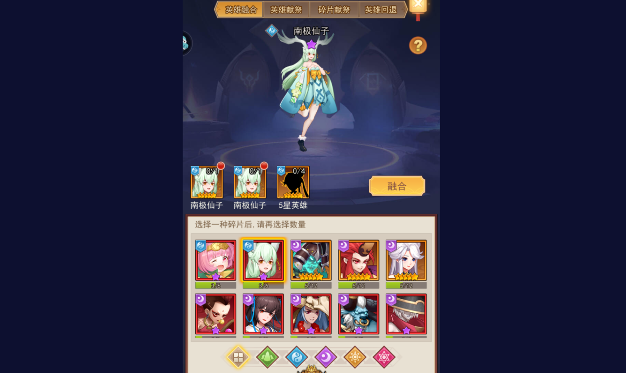 除了融合升星消耗多余的英雄之外,还有英雄融合和英雄献祭这两种方法消耗多余的英雄。我们先来说英雄融合,英雄融合可以将低星英雄融合成同名的高星英雄,合成成功后的英雄将会继承主英雄的等级和与进阶等级。融合成功之后,狗粮英雄都会返还所有的消耗材料,这个功能还是很良心的。