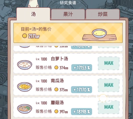 游戏里的汤的等级还能提升,价格和品质也会变化,所以研发出来之后大家还可以想办法升级这些,提升了之后能买的价格高了,赚钱的速度就快了,高品质还能收获不少好评。