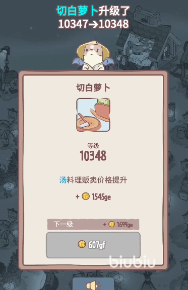 游戏在一开始的时候玩家们只有一口锅,一只猫咪。一开始我们所获得的的第一桶金便是从熬汤之中获取。在刚开始的时候我们熬汤所获取的金币并非很多,玩家们所需要做的便是先提高熬汤和料理的等级,这样获取的金币才会更多。