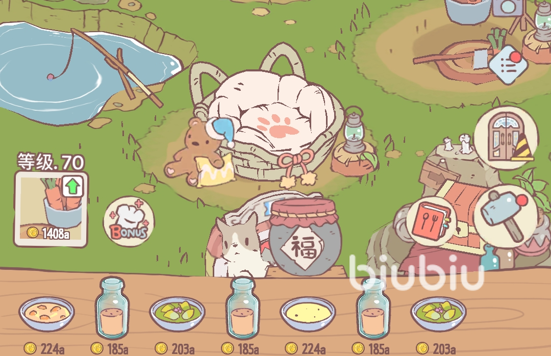 此外,游戏还有很多免费获得金币的方式,像是神秘的小动物造访就会带来一些金币奖励。还有不定时飘过的热气球以及下方出现的猫猫坛子,都带来了许多免费金币。