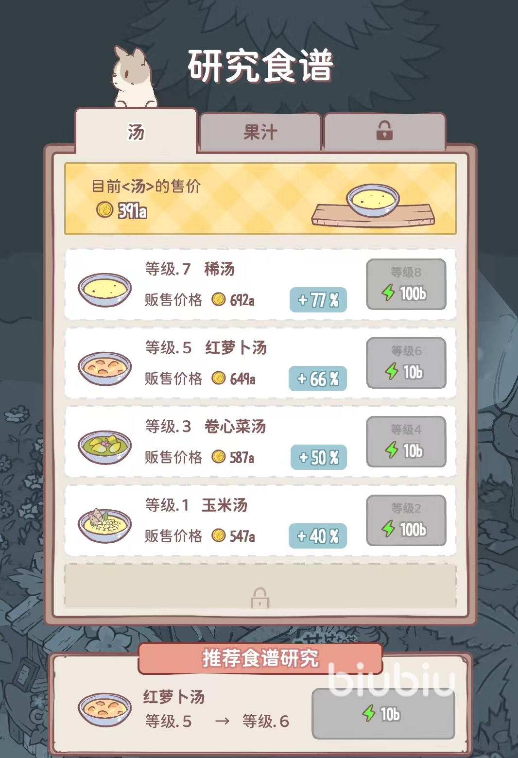 如果大家想要快速解锁更多的汤,就需要猫咪们不断的工作,做出来新的菜进行售卖,然后提升各个食谱的等级。随着大家等级的提升,能够做的菜就越来越多了,地图板块也会越来越大,需要招募更多的小猫咪工作。