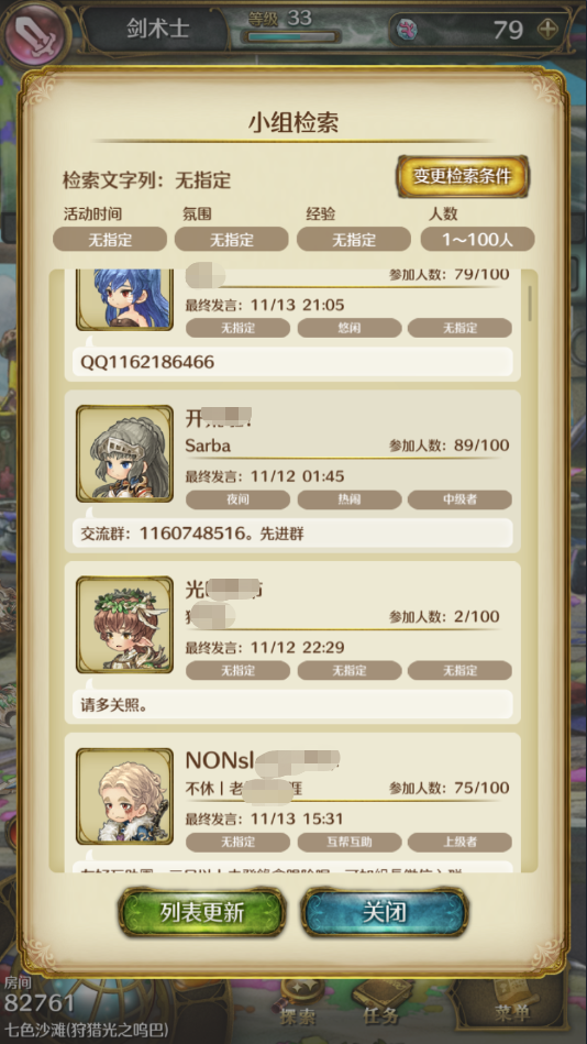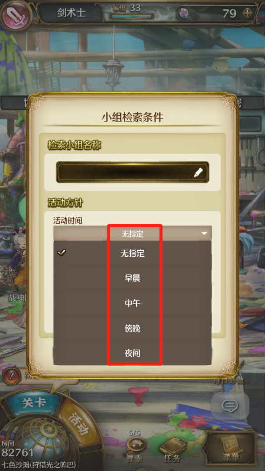 4、检索:这个就是搜索公会用的,点击可以打开小组检索体检。玩家可以按照小组名称来搜索,也可以使用搜索条件自定义搜索。搜索条件有活动时间、氛围、经验、人数。