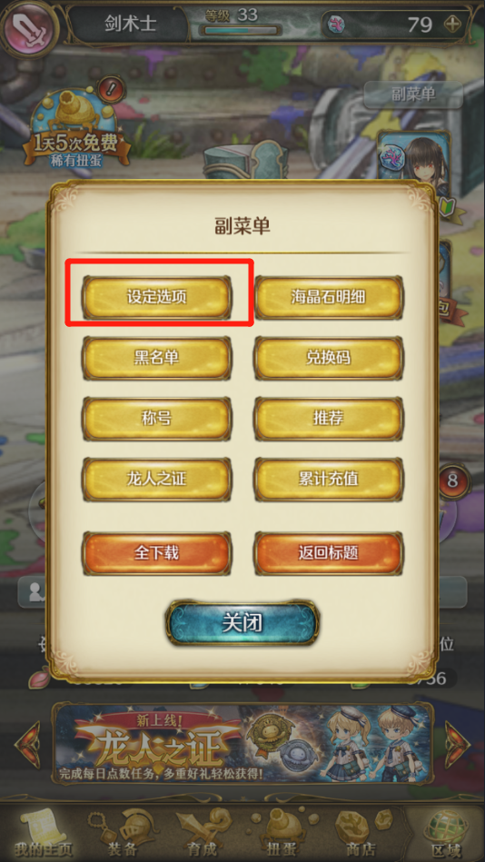 (2)如何调整:首先进入到游戏的主页面,点击右下角的“菜单”按钮,然后点击右上角的“副菜单”(小编已经在图片中标注出来)。副菜单中一般出现的都是设置类型的功能,点击左上角的“选项设定”就能查看并调整音乐、声效语音。