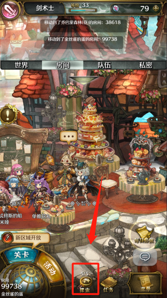 (1)探索功能:在地图上有发光的地方是可以点击的,点击后随机得到奖励,有几率掉落稀有的道具,比如非常强力的四星腰饰等。有些探索两点可能会刷新在房顶上,这个必须缩小当前界面才能查看得到。