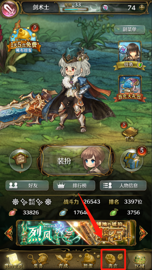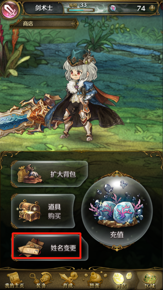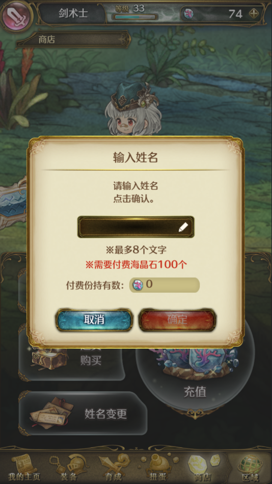 (2)海晶石修改:如果玩家想要再改名字,那么就需要消耗海晶石来修改了。首先进入到游戏的这页面点击右下角的“区域”按钮(小编已经在图中标注出来),打开后点击右下角的“商店”按钮。在这个界面就会出现“姓名更改”字样,玩家点击姓名更改功能,改好大家想要的名字然后点击“确认”即可更改名字,不过改名字需要消耗100个海晶石。