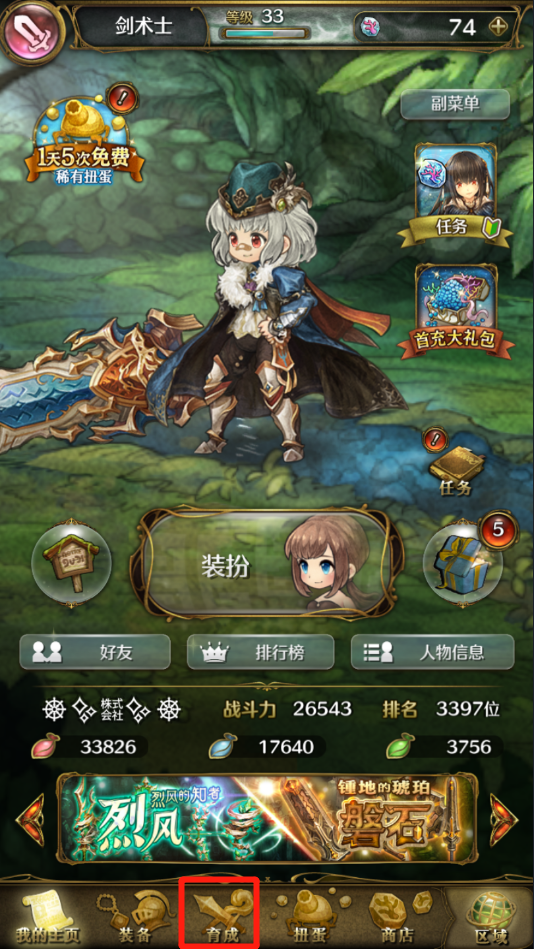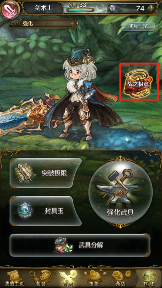 (2)如何打开:在达到上述条件的情况下进入到游戏中的“主页面”,点击右下角的“菜单”按钮(在图中为大家标注出来了)。然后点击最下方中间的“育成”,打开育成系统之后就能看到右边的中间有一个“战之极意”,点击打开即可。