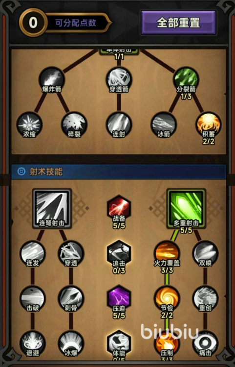 第一套技能加点推荐大家学习连续射击,然后再搭配复仇以及追猎。这样就可以保证输出能力能够直接达标,不至于输出一波之后,接下来的伤害就不足。如果再搭配复仇的话则能增强一些反击能力,当怪物进攻一波后你还可以继续站起来输出。另外多种火力输出的方式,也能提升你的命中率,不至于让你的攻击被对手躲掉。