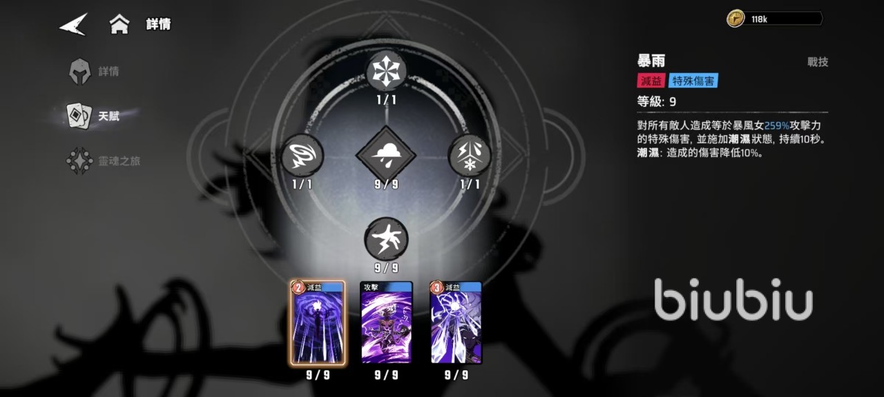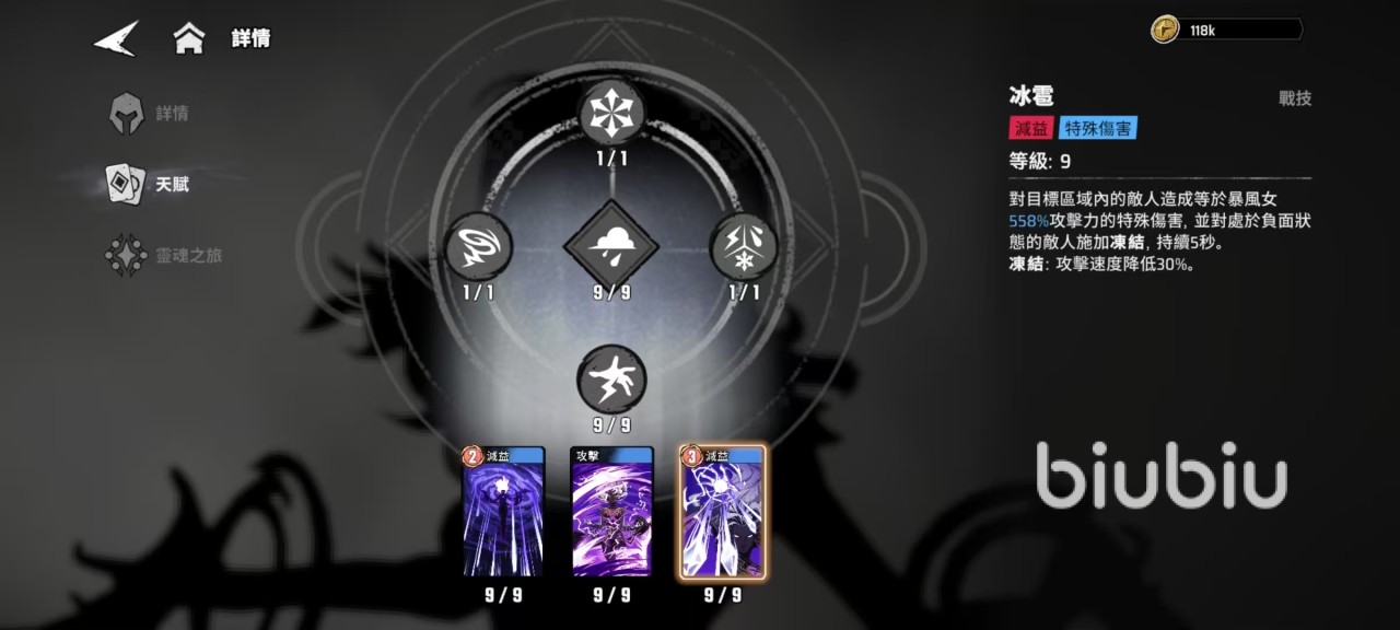 暴风女的两个战技分别是暴雨和冰雹。暴雨的效果是对所有敌人造成特殊伤害,并施加潮湿状态,持续10秒钟,对方被潮湿影响后,造成的伤害降低。冰雹的特点是对目标区域内的敌人造成特殊伤害,对处于负面状态的敌人施加冻结,持续5秒钟,冻结之后对方的攻击速度降低。这两个技能相辅相成,暴雨的潮湿状态可以触发自身的被动伤害加成,以及冰雹的冰冻效果,这两个技能的一个是伤害降低,另一个是攻击速度降低,可以大幅度限制对方的输出,在群体战斗中限制对方非常有用。