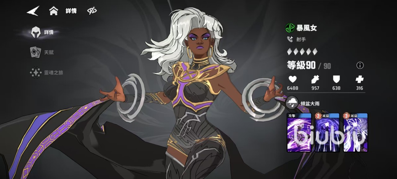 暴风女属于基因突变型的英雄,自身的定位是射手,也就是在后排输出,伤害比较脆弱,但是攻击力较高。暴风女的天赋是倾盆大雨,对有负面状态的敌人,造成的伤害有额外加成。这样的被动就代表暴风女非常依赖队友的配合,除了自身带有减益效果之外,建议搭配上其他有负面状态的队友,例如霹雳火等,这样在输出方面还能进一步提升。