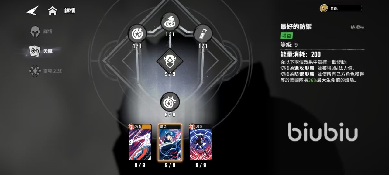 美国队长的终极技是最好的防御,在两个效果之中选择一个发动,切换成进攻形态时,额外获得3点法力值,切换为防御形态时,使我方所有的角色都能获得护盾。所以美国队长在保护团队方面还是非常出色的,而且此技能的能量消耗相对比较低一些,可以更快发动。战技能盾牌飞掷,投掷出盾牌,盾牌在敌人之间进行最多4次弹射,造成物理伤害,并根据当前的形态获得额外效果。在进攻形态下,我方角色优先攻击选中的目标敌人,在防御形态下可嘲讽所有敌人,持续6秒钟。
