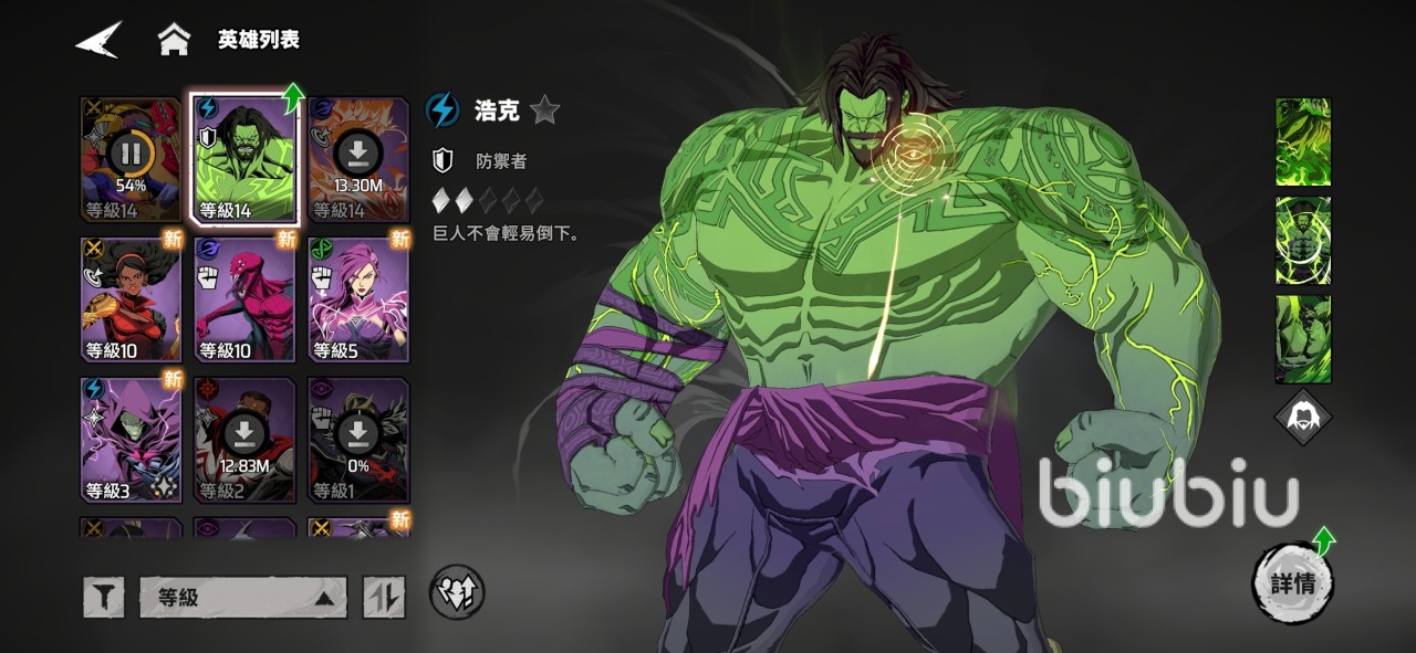 这是一组开服就能成型的队伍,角色获取门槛极低,非常适合新手。浩克作为开局就赠送的坦克,本身血量厚实,还具备控场与回血能力。他的技能多数依赖最大生命值进行伤害判定,因此只要堆生命属性,就能同时提升坦度与输出。再加上范围击飞和持续回血的终极技,使他在推图时能充当稳固的前排,拖住敌方火力。