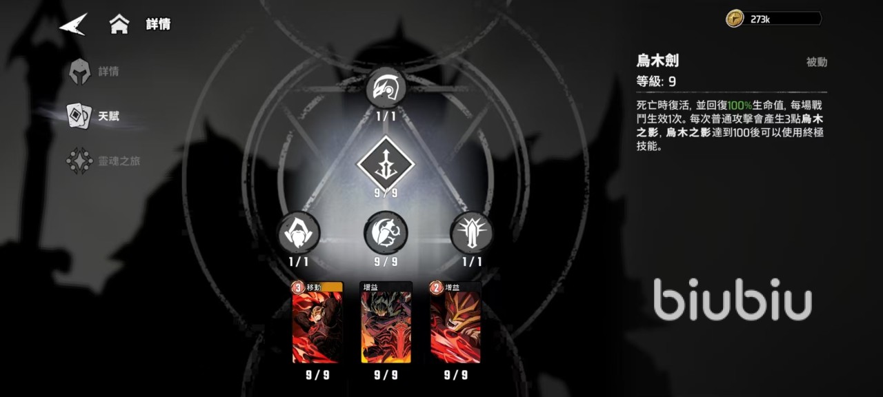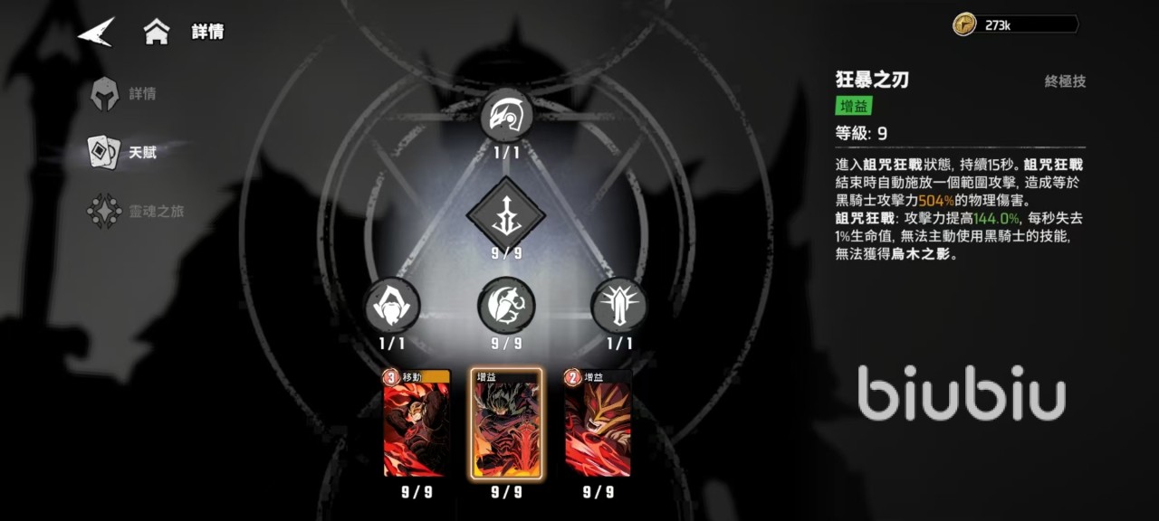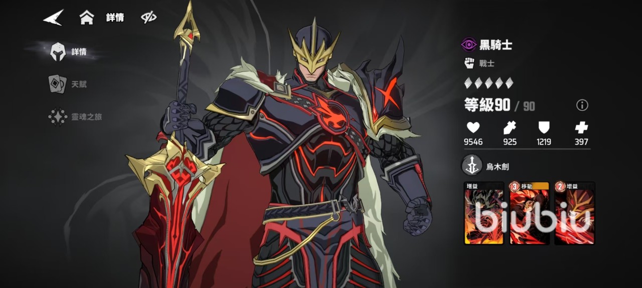 黑骑士是属于战士类型,他的被动乌木剑,在死亡时能够直接复复活,并且恢复100%的生命值,每场战斗都能生效一次。每次进行普通攻击时会产生3个乌木之影,乌木之影积累到100后可使用终极技能。黑骑士的战技乌木诅咒,消耗2点法力值,获得30个乌木之影,并使普通攻击伤害提高,持续15秒钟。这是一个常规增益类技能,提升自身的终结技释放节奏,增强普攻伤害。