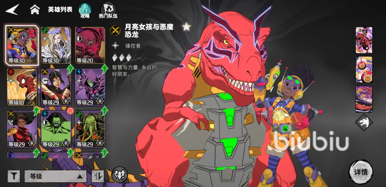 月亮女孩与恶魔恐龙、线魔,核心神器为“力场手套”提升自身的生命值保障生存,延长召唤物存续时间,其次“不稳定分子”的提高攻击力或“神宫护盾”的增加防御也是不错的,能直接帮助我们去强化本体与召唤物的协同作战能力。