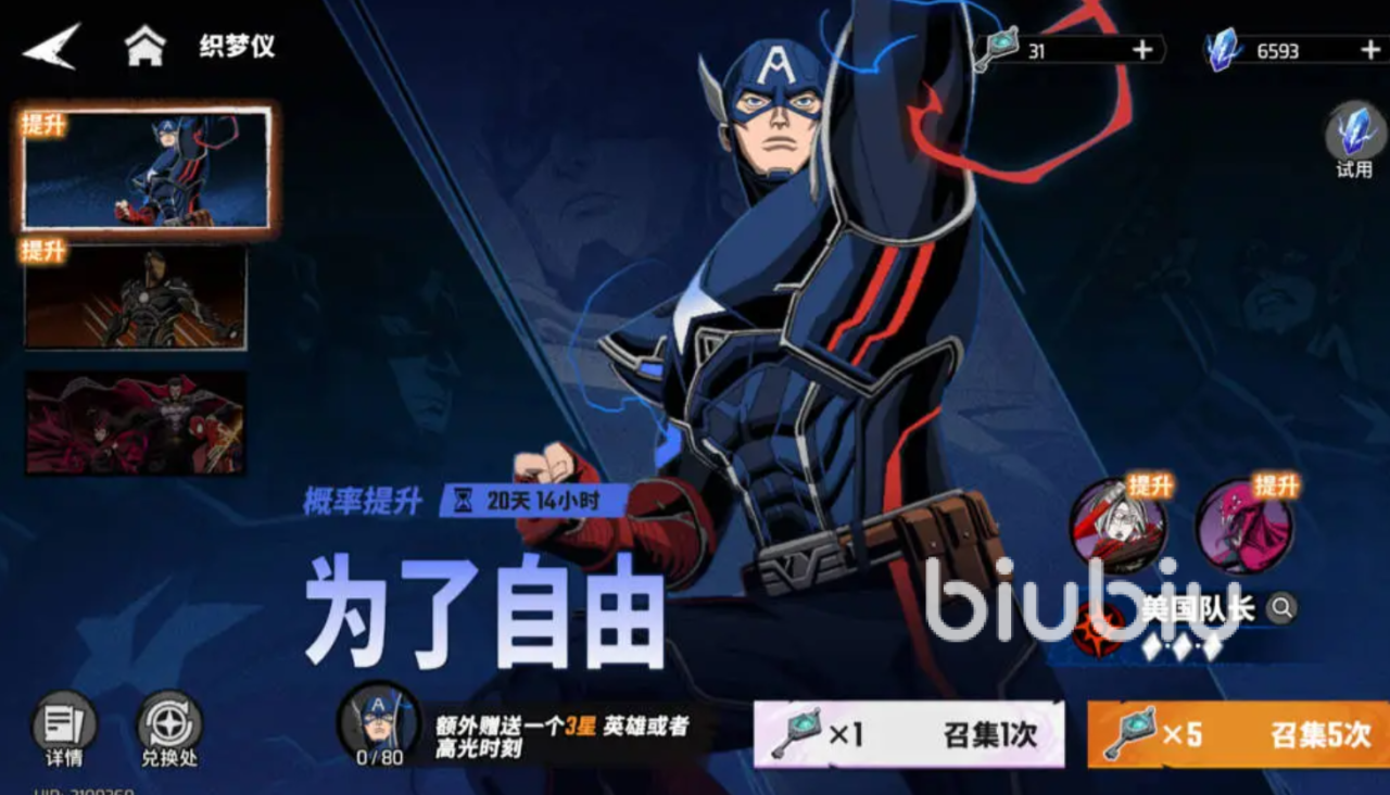 首先推荐美国队长,这是非常稳定前排角色,攻防兼备,可在攻击形态和防御形态之间自由转换,能够适应多种不同阵容,被动影响下,开局自动进入攻击形态,释放大招可切换为防御,这个状态下提升互动能力,盾牌还可悲作为投掷武器使用;这个角色就很适合新手培养,担任输出和保护都是可以的,初期队伍稳定的核心所在。