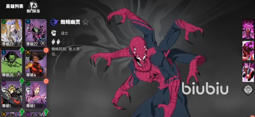 第二个选择蜘蛛幽灵,这是高爆发的近战输出英雄,对于单体,或者BOSS具有较好的克制作用,每损失4%生命值,就能触发一次闪避提升效果,被动的触发频率是比较高的;1技能对对手和相邻单位造成物理损伤;