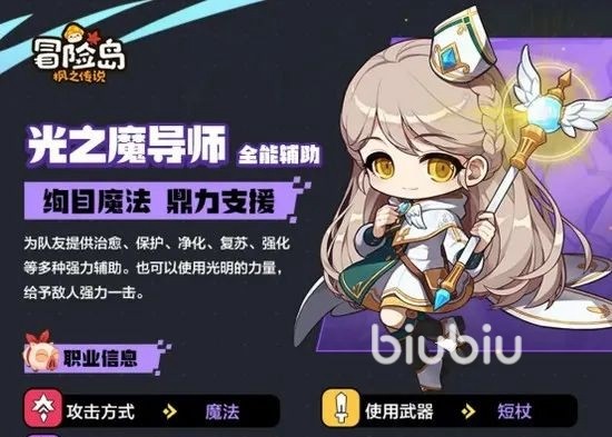 一、光之魔导师:全能型的辅助系职业,可以用来给队员叠buff和恢复。这个职业的话比较适合没有接触过冒险岛的玩家,因为前期的培养比较简单,在打混沌远征的时候这个职业必带。