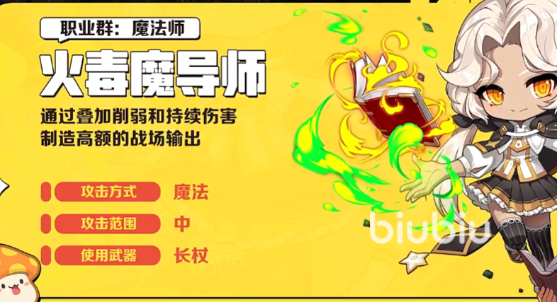这是一个魔法师类型的职业,主要是通过长杖来使用魔法对敌人进行攻击,通过释放毒雾还有火焰来使得对手持续受到伤害,主要的属性是智力,副属性的话是幸运,根据她的这些特点,来选择的技能如下。