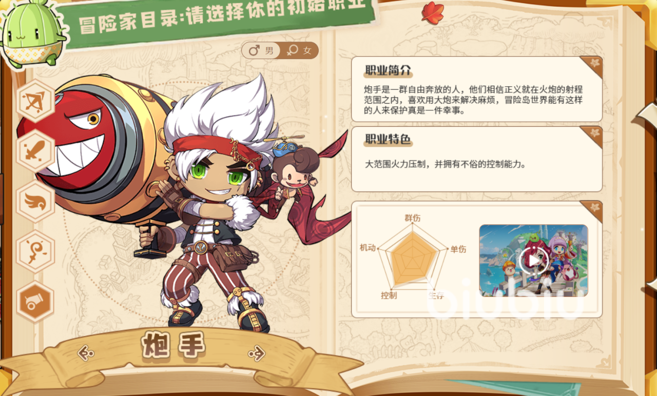 接下来介绍的是炮手,炮手作为远程物理输出职业,和弓手最大的区别就在于他拥有控制手段,并且他的群攻手段也比弓手要丰富,炮手是五个职业里面控制能力最强的,在打某些特定副本的时候如果炮手可以控制住boss通关将事半功倍,他的技能主要是远程的眩晕和中等输出技能,论单体输出他的伤害量不敌飞侠和弓手,能担当队伍里的副C。