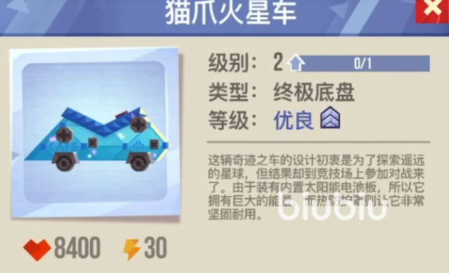 那么说到游戏中的终极部件,这第一个要带大家看的终极部件叫做猫爪火星车,该部件是一个底盘类型的部件,等级为优秀,血量为8400,能量为30。之后是一个叫做火焰危机的部件,也是底盘类型的部件,等级为精致,血量为6000,能量为25。