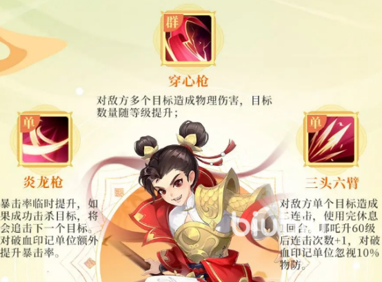 每当说到哪咤,人们总会想到手里拿着炎龙枪,此游戏也将该武器融入其中作为单体伤害技能,暴击率随着角色等级提升也会有所增加追击下个目标造成额外攻击。三头六臂属于专项技能,可对单个目标造成连续两次攻击,当升级到60级之后,攻击次数会直接加。