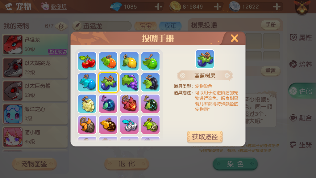 相反,迅猛龙这一类的野生宠物,在进化的过程当中,玩家们只需要使用各类的树果道具。树果道具准备得越多,那么迅猛龙在完成进化之后,各种属性的提升就会变得越高。玩家们也可以通过各种支线任务和主线剧情去获得大量的树果道具。该道具也能够直接通过交易行进行获得。需要大家注意的是,迅猛龙只吃蓝蓝树果。
