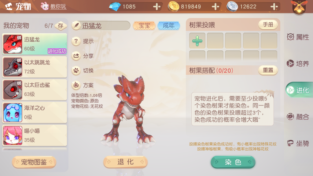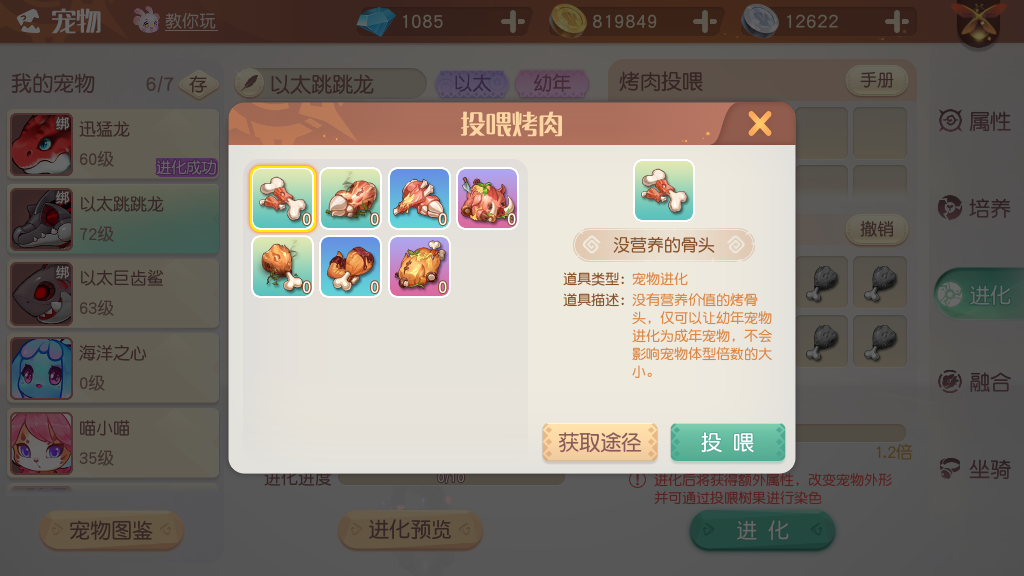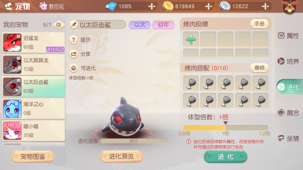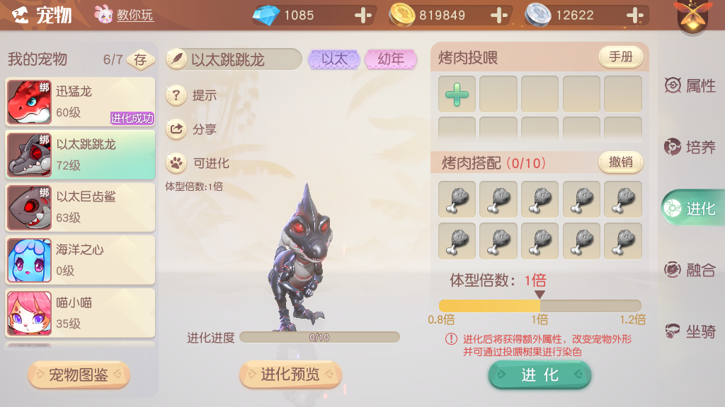 首先,进入到我的宠物页面,玩家们就可以在该页面下看到宠物的各种讯息,通过右方的选项当中,能够直接看到进化的选项。不同阶段的宠物在进化的过程当中,需要消耗的游戏道具是不一样的,例如以太类型的宠物,想要完成进化就必须要使用大量的烤肉。烤肉吃得越多,野生宠物的进化成功率就会变得越大。