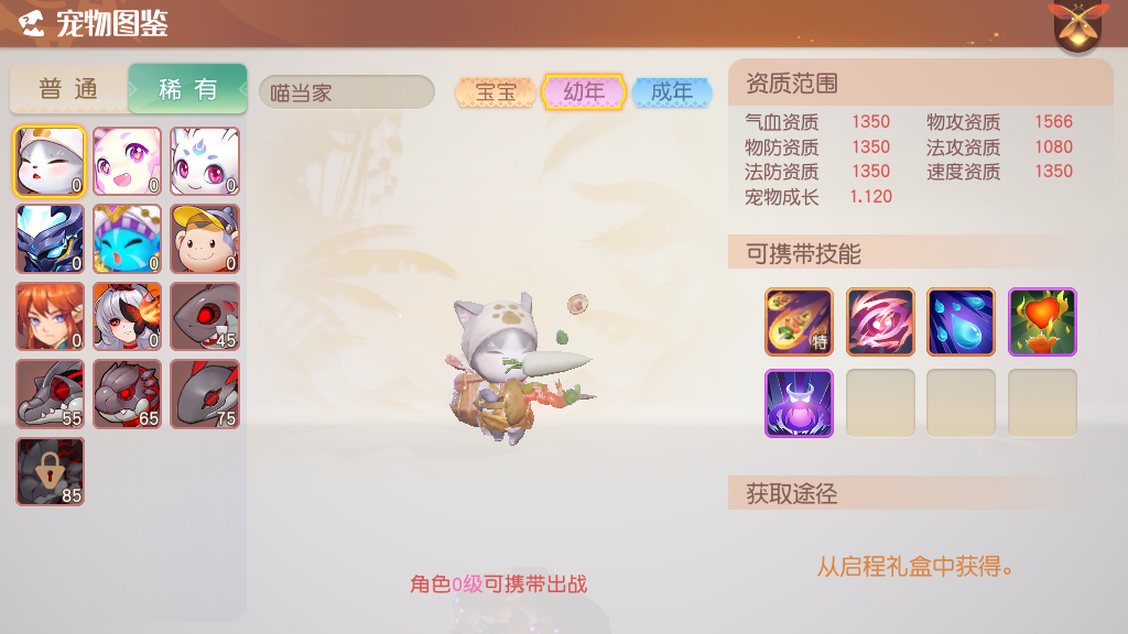 而游戏当中,除了神兽元素能够得到非野生的高等级宠物,另一种特殊的宠物只能够从启程礼盒当中获取。该礼盒大部分情况下只会出现在游戏的活动任务,玩家们想要得到启程礼盒就需要时刻留意各种活动任务的开启时间。得到该礼盒之后,打开即可获得一只非野生宠物。