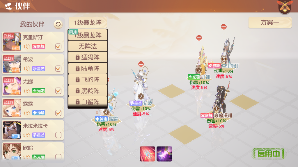 最为简单粗暴的一种阵法,就是暴龙阵。该针法降低了一定程度的速度,从而提神整个队伍的输出能力。尤其是法师这样的输出职业,伤害输出能力的提高,就可以更快的结束战斗,从而获得更多的胜利。从站位上来看,该阵法让前排的角色变多,四名角色全部安排的前排,而后排只需要玩家角色一名即可。在战斗当中,可以让前排角色抵挡住跟多伤害,玩家角色在后排只需要尽情的输出即可。