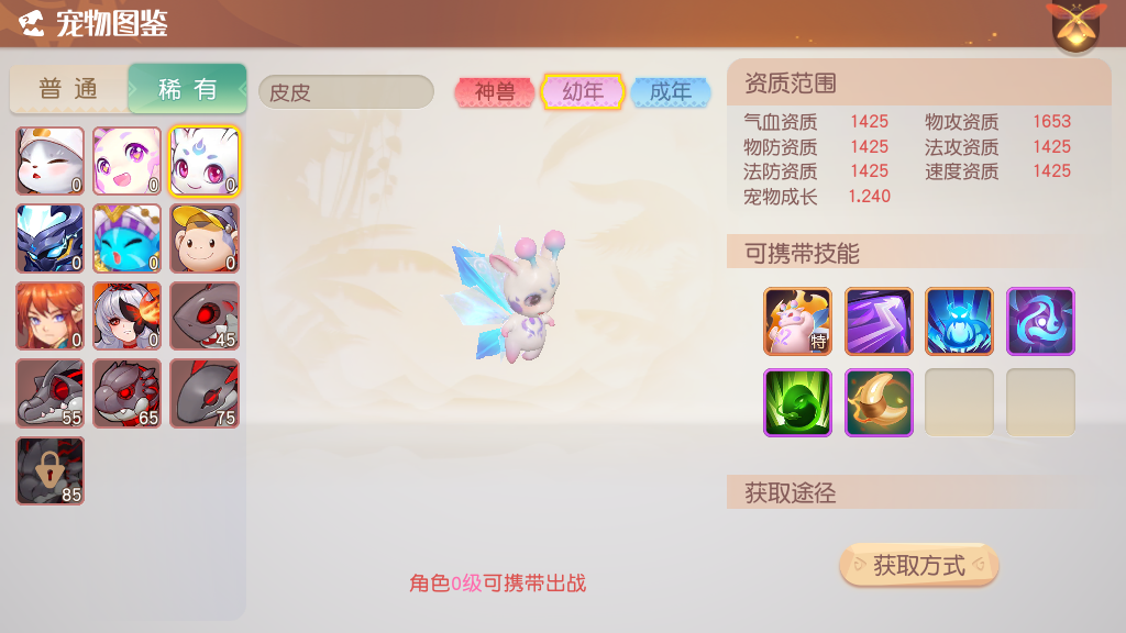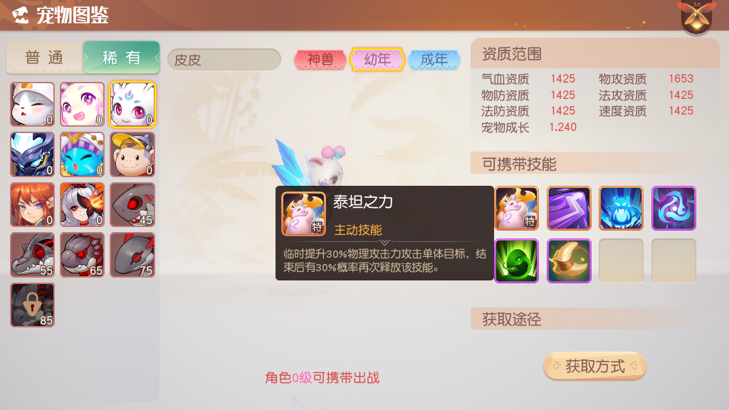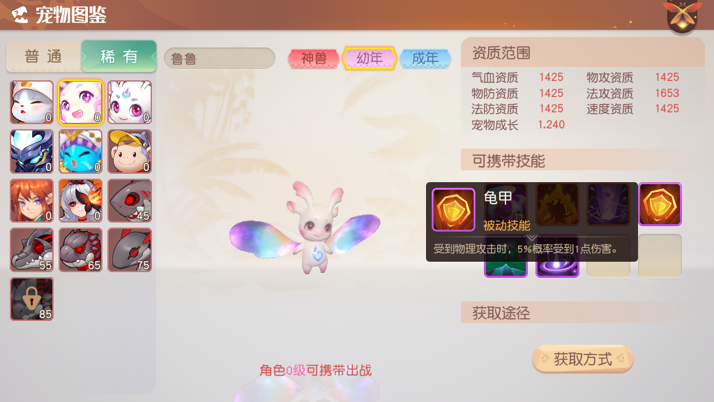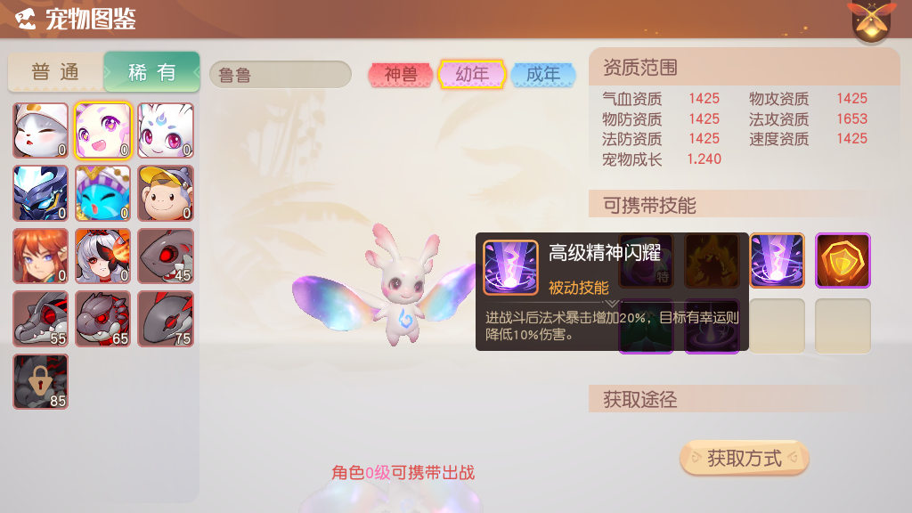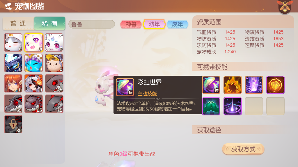 首先聊一聊鲁鲁,作为一名稀有的宠物,自身作战技能高达六种,每一种都可以在战斗当中发挥出相应的作用。例如自身的被动技能彩虹世界,可以对多名敌人造成80%的法术伤害,随着等级的提升,造成的伤害还会变得更高。而高级激愤技能,还可以在战斗一开始的情况下,为我方的所有角色增加5%的法功和物攻。