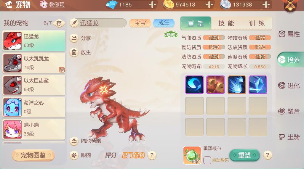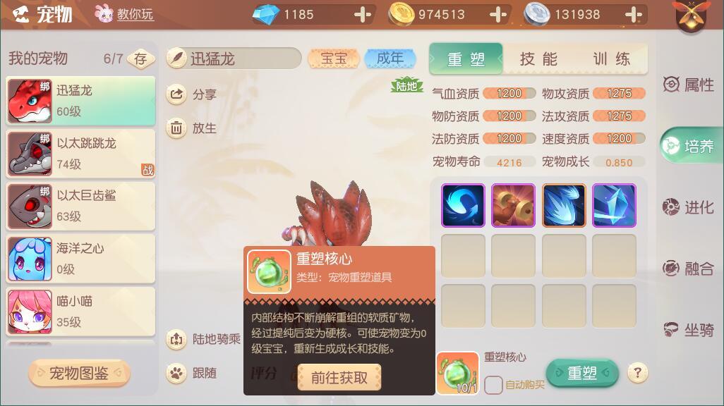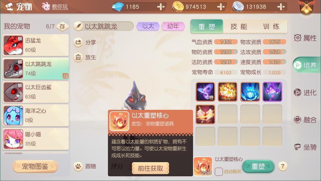 以上是以太类宠物的合成方式,像迅猛龙、海洋之心、喵小喵这一类宠物,玩家们需要准备好大量的烤肉,以及重塑核心道具。准备好了这些相关的物品之后,即可展开宠物的合成。目前,游戏当中的合成小技巧就只能通过这些方式来实现。