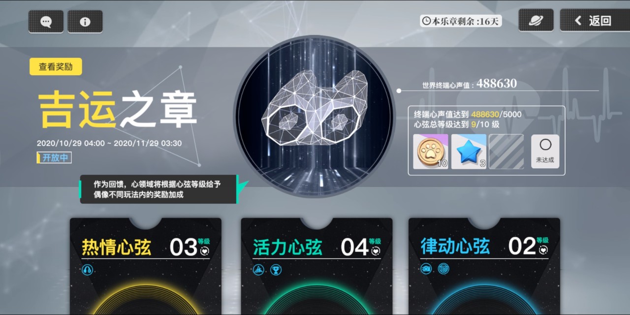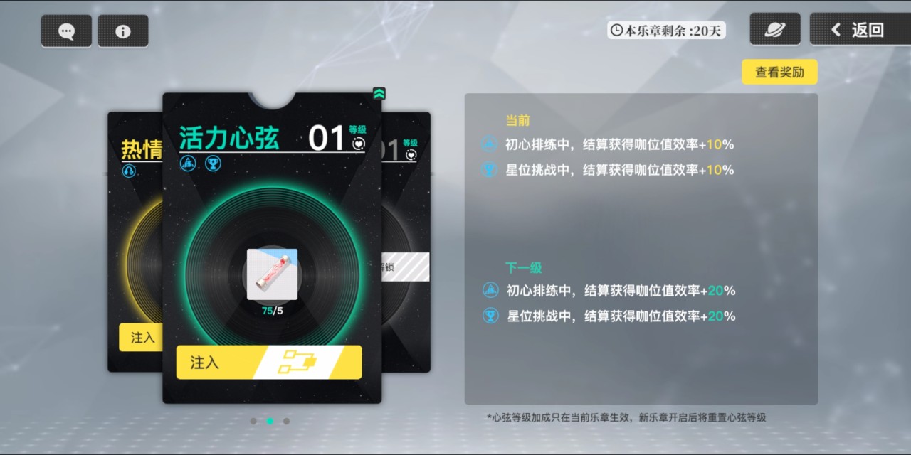 在主页中右侧有一个手机图样的终端,打开后在右侧中间栏有一项是心声,点击进入后可以看到热情心弦、活力心弦和律动心弦。任意点击后可以发现需要消耗某些物品(吉运·轻音和吉运·重音等)来升级。升级后可以提升在不同关卡中咖位值的获取效率,而所需要的材料一般可以在星位挑战、时尚秀场和音之扉中获取。可以直接在心弦页面点击物品头像进行跳转。因此在获取咖啡值之前进行心弦升级是很有必要的。