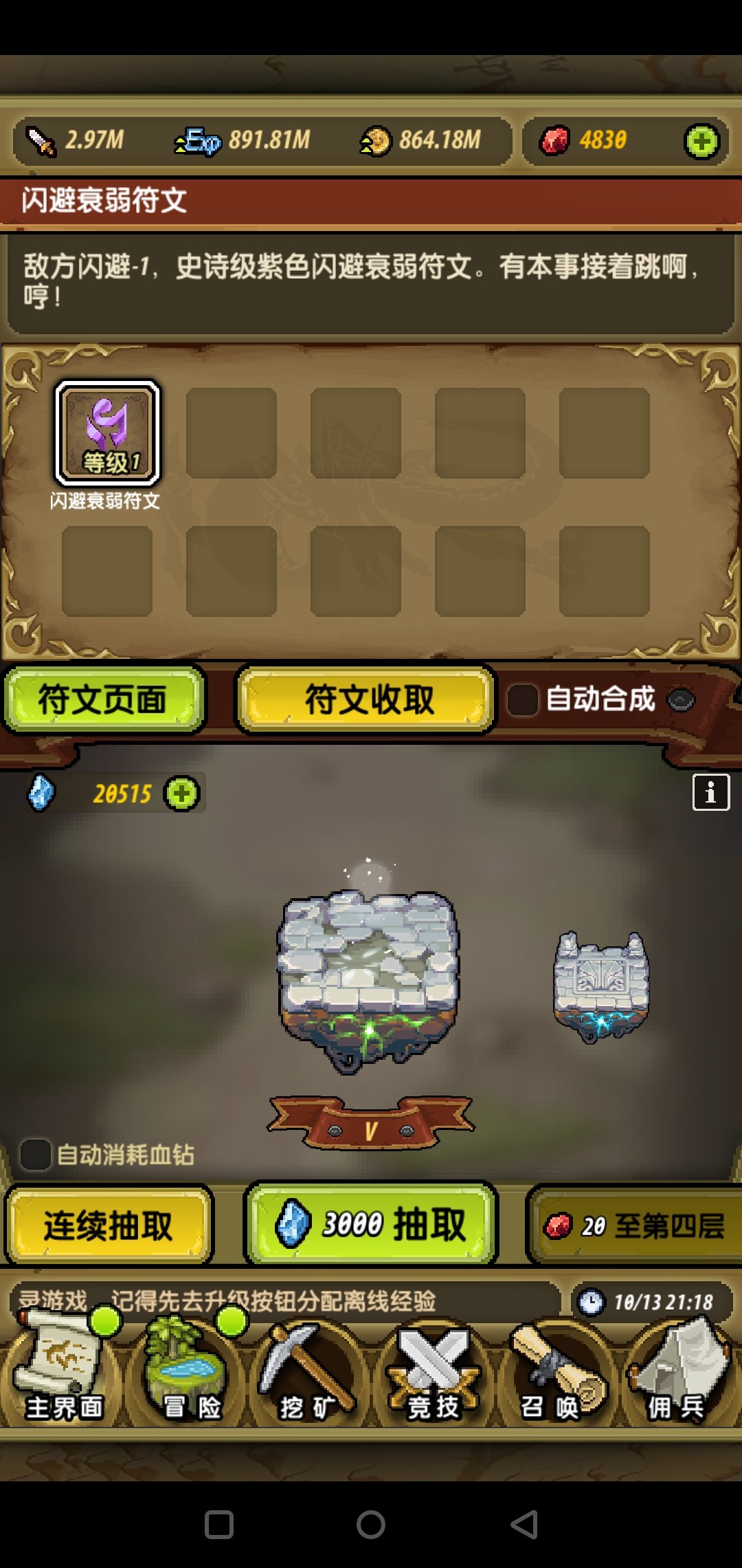 小伙伴们可以通过在挖矿系统的水晶运送任务来获取水晶,然后花费水晶去抽符文,符文分5个等级,越高级的符文就越难抽,这个时候我们只要有充沛的水晶砸进去就可以有越高的几率抽到符文,并且符文的升级也需要吸收其他符文,所以水晶的最大作用就在这里,可以用水晶转换成我们阵容的实际战斗力,利用拔高自身四维属性或者降低对手四维属性。
