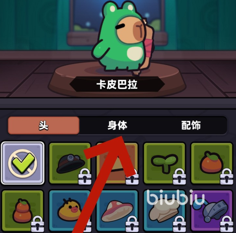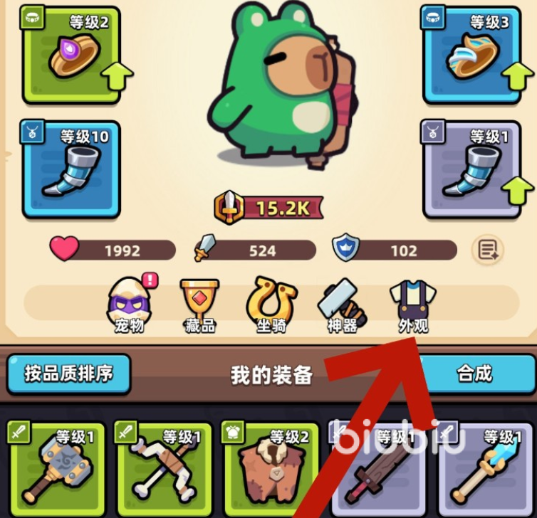 更换外观非常方便,首先是进入到游戏主界面,然后点开下面一栏中从左起第二项,也就是“头盔”的图标,然后玩家会来到小水豚的属性装备栏界面。