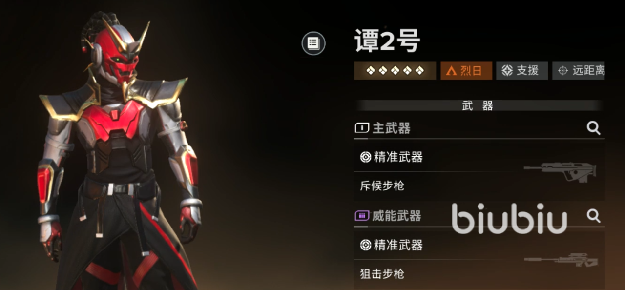 谭2号是烈日支援角色,他的特性可以在使用步枪精准击中敌人时,额外积累当下的能量,他的被动能在晨星、慕星状态下,分别积累两种不同的能量,积累到100点后会让下一次使用的余晖或曙光得到强化效果,他的“余晖”会向着准星方向打出一颗火球,伤害敌军的同时施加侵蚀和灼烧效果,他的“曙光”会打出一颗治疗光球,持续治疗自己的队友,他的“星移”会让自己从慕星状态切换成晨星,他的大招会跳跃后形成庇佑区域,为队友带来持续性高额团队增伤。