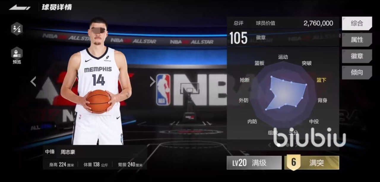 需要注意的是周志豪在中投和三分属性方面偏低,三分只有47,中投也只有82,速度方面也仅有57,这也就意味着在实战过程中,想要依靠周志豪来拉开空间,几乎是无法实现的。好在拥有140体力,这样在防守端还可以较长时间跑动。这名角色是属于新秀球员,所以目前暂时没有徽章。在实战中篮下防守能力可圈可点。进攻回合因为速度比较慢的缘故,非常推荐和投射型的队友一起搭配,主要打的就是持球档,还有在篮下吃饼能力也是很不错的。