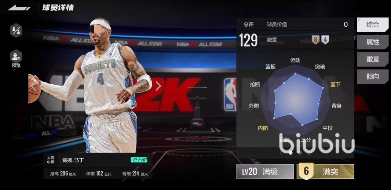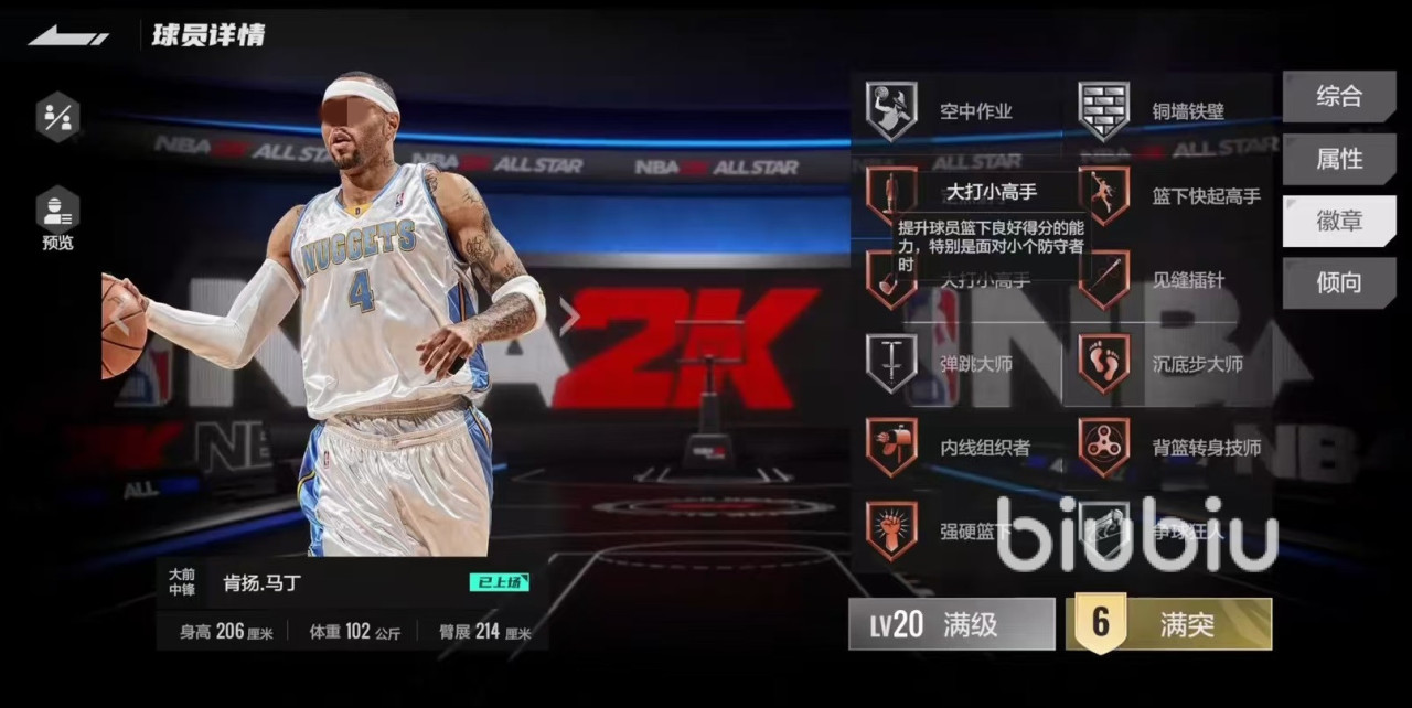 徽章方面作为历史球员是比较多的,例如它所具有的银空中作业,铜篮下快起高手,铜沉城底部大师,铜背篮转身技师,铜强篮下,让马丁可以在三秒内有着很不错的进攻威胁,还具有银铜墙铁壁,铜大打小高手等,能够在挡拆错位中有着更高效率。