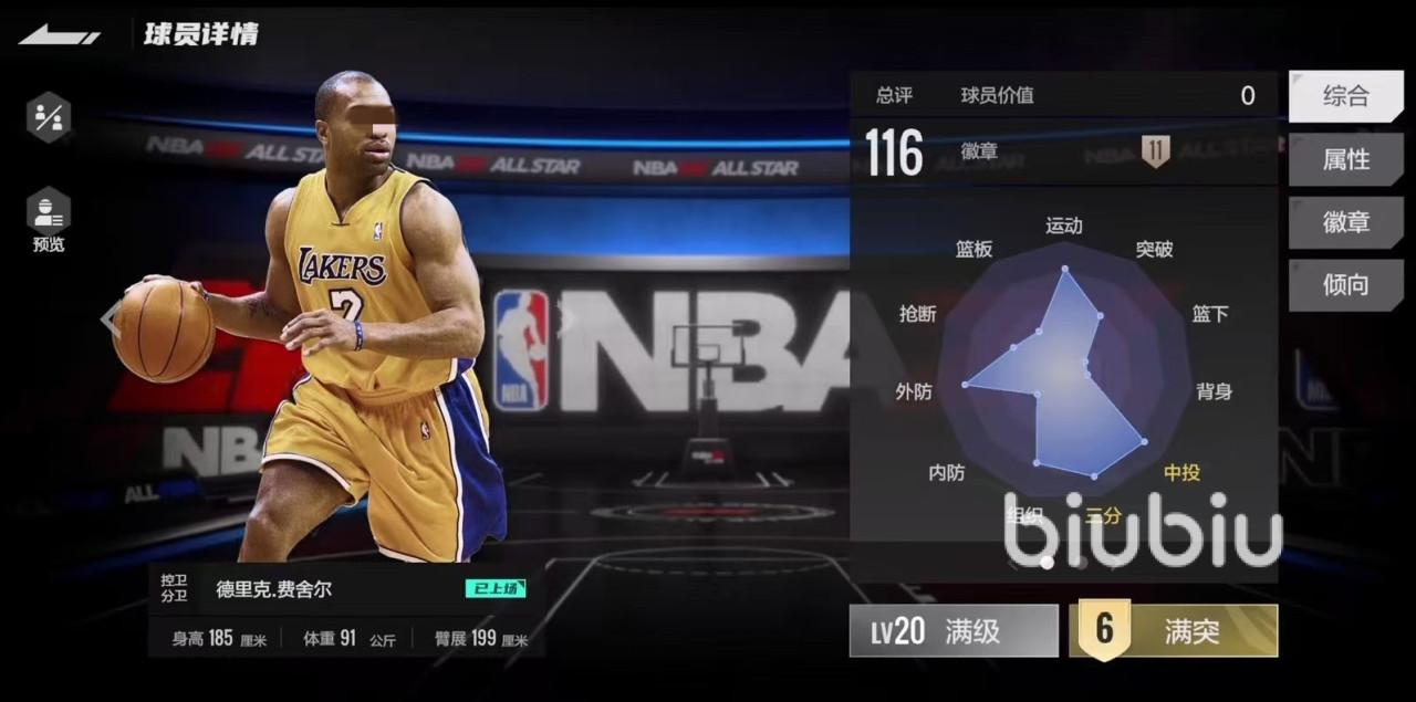 接下来看一下具体的属性,拥有135中投和140三分,这样的属性使其具有了顶级后卫的投射基本能力,还有140控球和135传球,作为控球后卫看家本领完全足够。其他属性方面,外防116,横移135,可以弥补自身在模型方面的不足,防守上也算有了一些优势。131的速度是小个子球员标准配置,这样的速度配合上模型,能够在场上自由灵活游走。特别注意的是,站扣和跑扣数值仅为25,这就意味着他几乎无法实现扣篮。