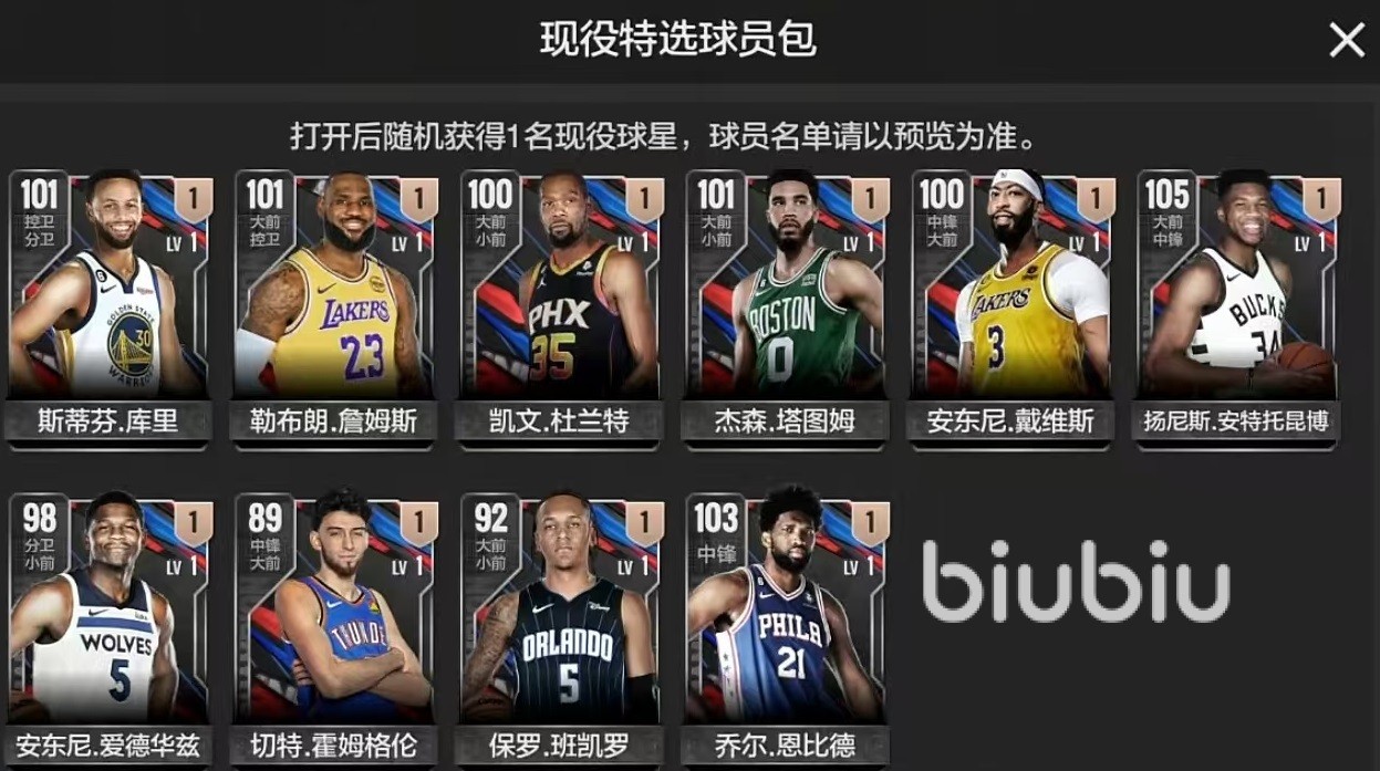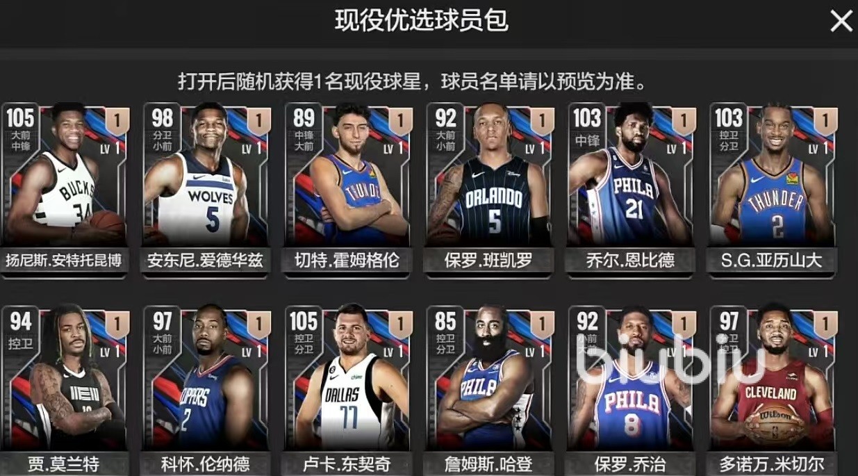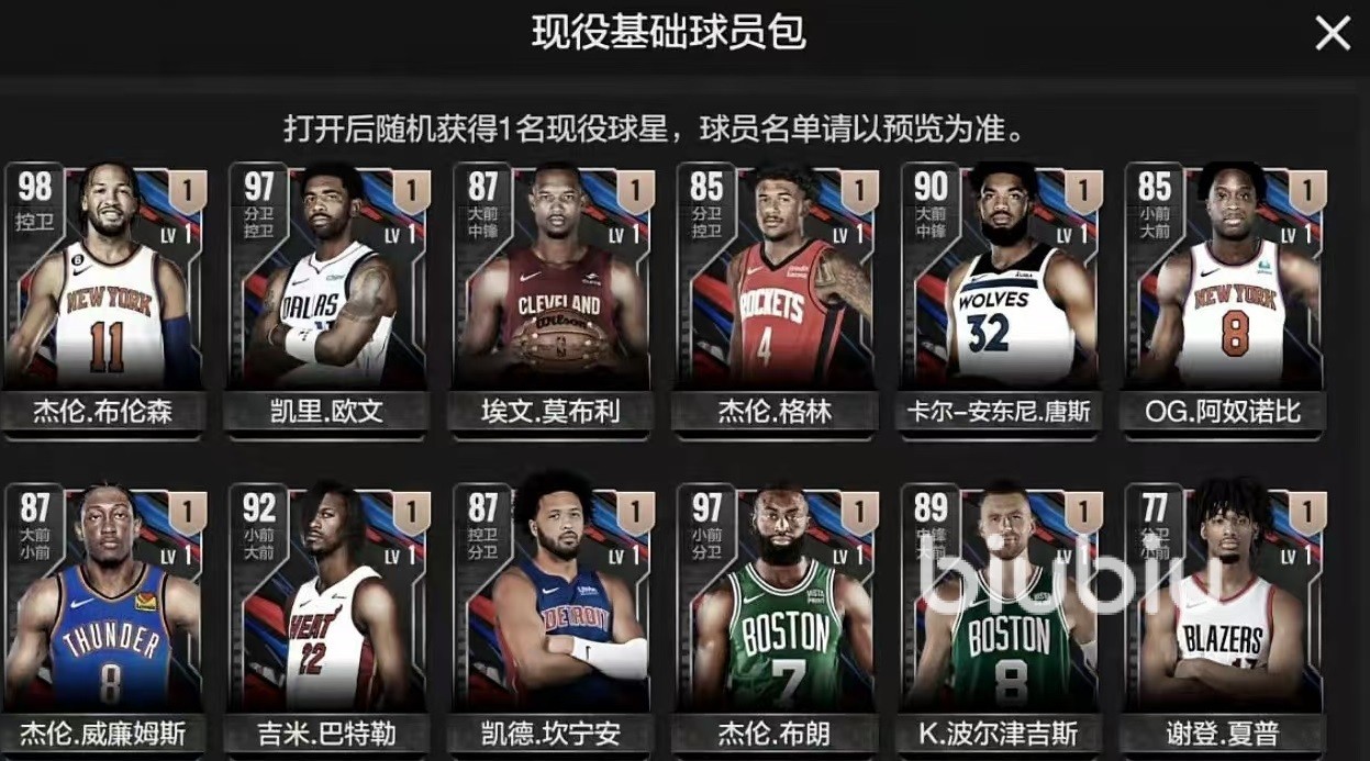游戏中有多种不同的卡包,卡包中所包含的球员卡数量也有很大的区别,先来看一下最基础的现役球员基础包。基础包装的大部分球员都是nba现实中的三四当家或者是角色球员。如果运气够好,通过及现役基础球员包可以开出50万会员费档次的布伦森和巴特勒等。如果大家抽到布伦森,小编建议是快速出手,因为他在实际使用的过程中其实并不强势。但是如果抽到了巴特勒,那么建议持有,这名球员还是很神奇的。