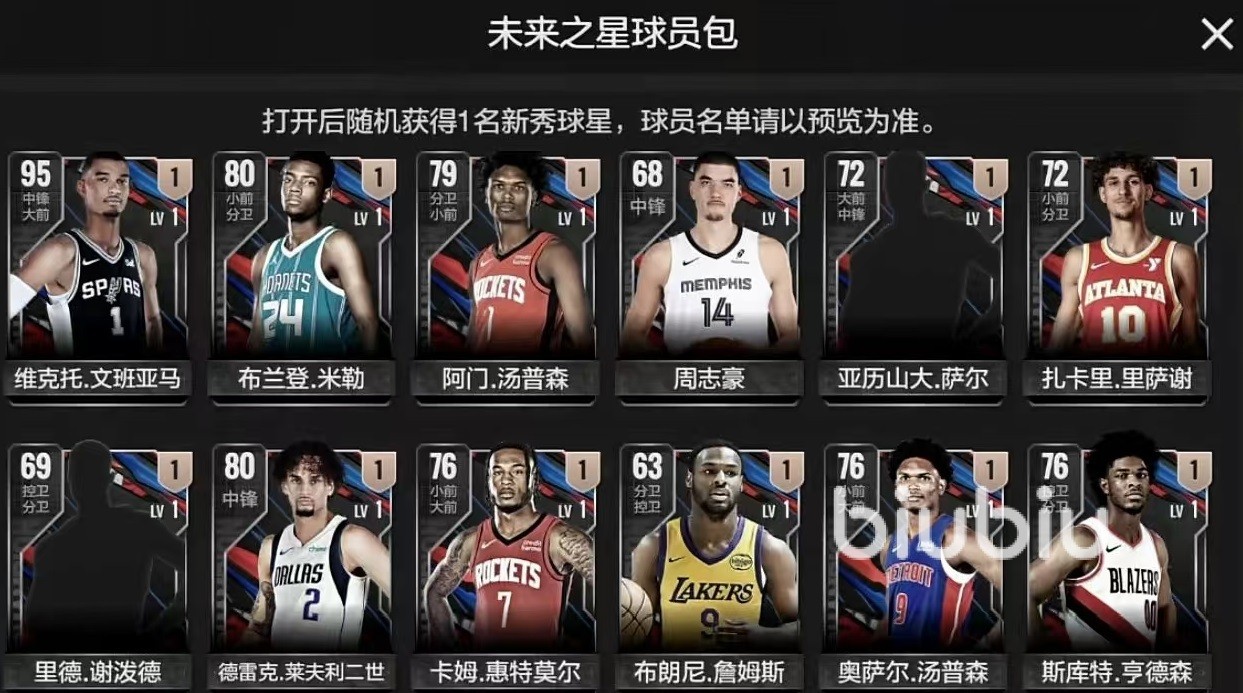 第5个是现役球员特选包,这里面一共有10名球员,包括勒布朗詹姆斯,凯文杜兰特,安东尼戴维斯等,都是顶顶大名的球星,每一个开出来都可以当做球队的核心。最后一个是未来之星球员包,这里面的球员主要是近两年nba出现的新秀,即有上限达到200万的文班亚马,还有初始价二三十万左右的球员,所以说这里面的差距也是比较大的。如果能够从这个包开出文班亚马,那么绝对是开服血赚,不过其他的卡并没有太大的作用。但是文班亚马只在新秀包产出。